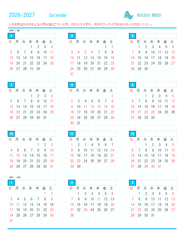 平素は格別のご高配を賜り、厚く御礼申し上げます。株式会社穂設計「2026年度営業カレンダー」について、下記の通りお知らせいたします。